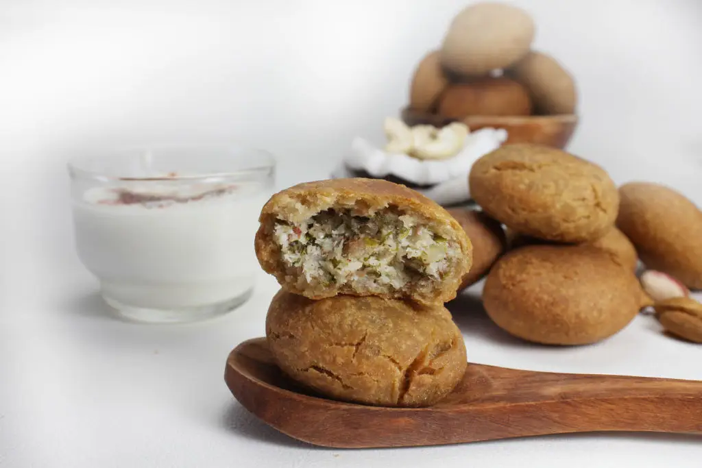 Kuttu ki kachori brings a flaky, stuffed pastry to the vrat menu using buckwheat flour. For the dough, combine kuttu flour with a bit of hot ghee and enough water to make a soft but firm dough. Traditional fillings include spiced mashed potatoes with roasted peanuts and mild aromatics like coriander and green chilies. Roll small circles, place filling, seal and roll gently again before shallow-frying until golden. Baking is an option for a lighter result—brush with oil and bake until crisp. The layered dough approach gives kachori a satisfying flake that feels festive. Kachoris are excellent for potlucks or when you want something special on a fasting day. If you can’t find kuttu flour, combine buckwheat flour with a spoon of singhara to improve elasticity. Serve these with plain curd or lemon wedges to keep flavors bright.
