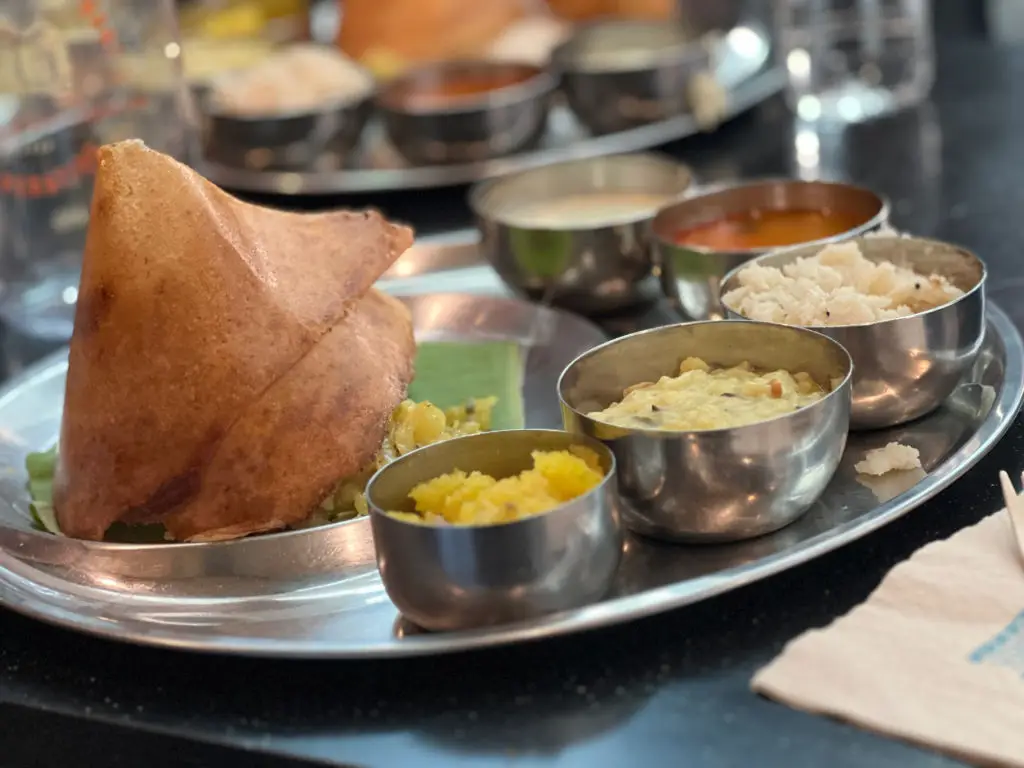 Saravana Bhavan is an easy place to begin your South Indian food education. This well-known chain serves classic vegetarian plates—soft idlis, crisp dosas, steaming sambar and strong filter coffee—across India and internationally. For travelers from North America, Saravana Bhavan offers consistent flavors and clear menu choices, which helps if you want a safe introduction to regional dishes. Order a dosa with coconut chutney and a side of sambar to learn how the interplay of textures and spice defines the cuisine. Portions are generally generous and the service is brisk, so it’s ideal for quick lunches or a relaxed breakfast. Many locations have English menus and staff used to international guests, which simplifies questions about ingredients or dairy. If you want to sample many items without ordering a la carte, ask whether a breakfast platter or mixed thali is available at that outlet. The seating is straightforward and the food focuses on technique—fermented batters, tempered dals and fresh coconut preparations—so it’s a good place to notice the little details that make South Indian vegetarian food so beloved.