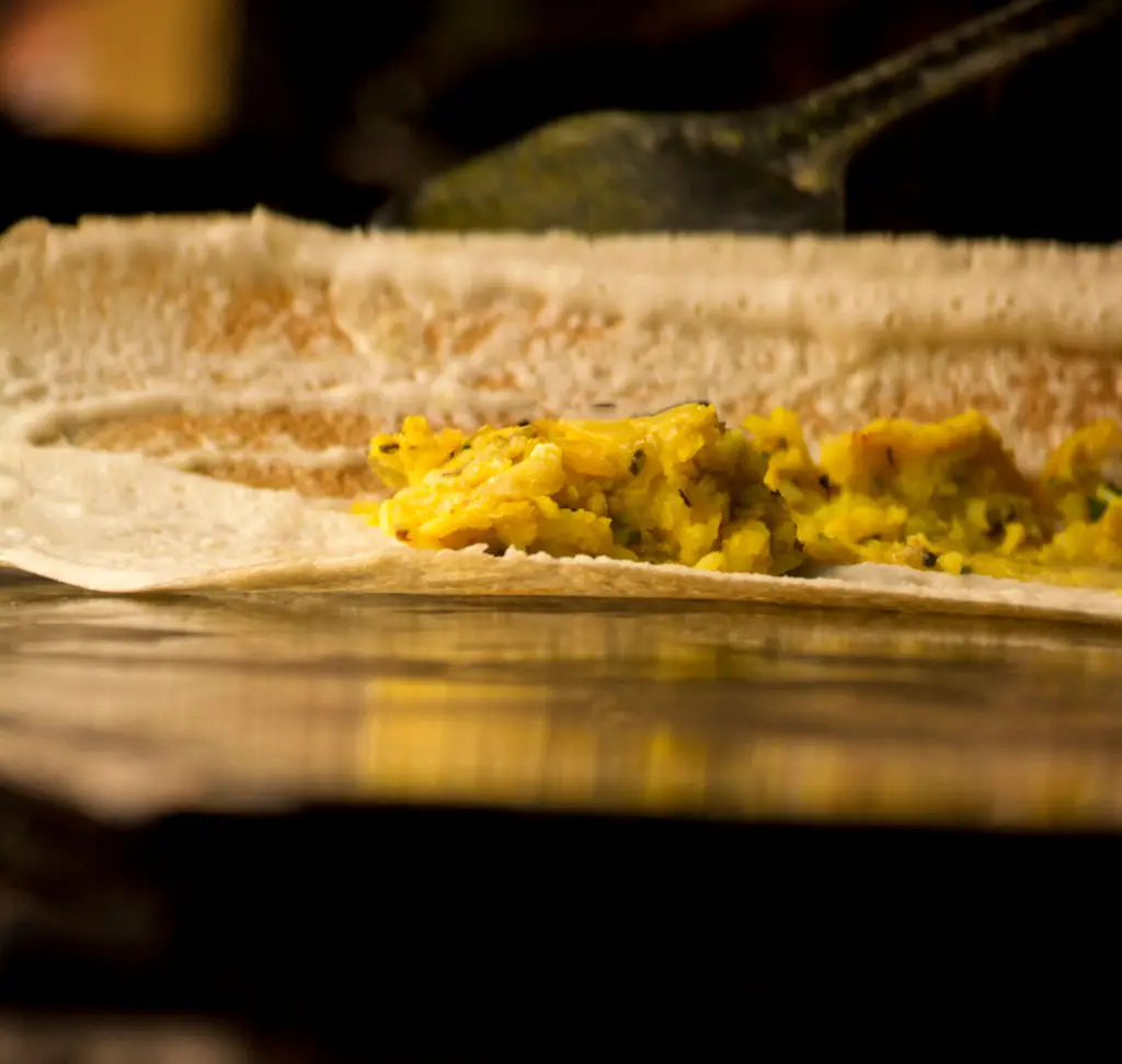 Dosa starts with a fermented batter, an area where safety and timing matter. Use clean cookware and a washed, dry container for fermenting. In cooler kitchens, keep batter in a warm spot like an oven with the light on or a warm corner; avoid leaving batter at room temperature for excessive hours. If you prefer a quicker option, use instant dosa batter mixes or a partially fermented batter and add a small amount of yogurt to jumpstart fermentation safely. Cook dosa on a hot, lightly oiled griddle; spread batter thinly and cook both sides until golden. The potato masala filling should be cooked through — sauté onions and spices, add boiled potatoes, and finish with fresh coriander. Serve dosas immediately so crisp edges stay crisp and fillings are hot. For longer storage, refrigerate batter and fillings separately and reheat filling until steamy before assembling; this keeps fermentation in check and reduces the chance of sour spoilage.