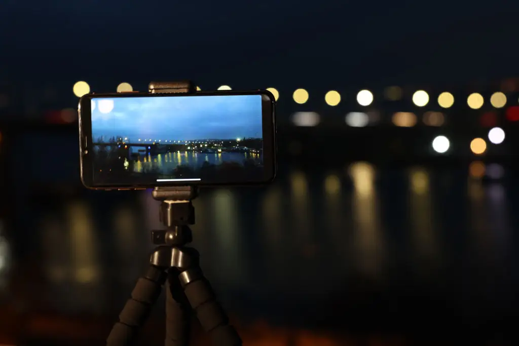 Your phone can be a quick detector even if it won’t match a full camera. Modern phones’ night modes gather light and can reveal faint aurora that your eyes miss. Take a quick phone shot facing north as a rapid test: if the camera shows a greenish glow, there’s activity. Small phone tripods or beanbags steady shots and improve clarity. Avoid using the bright screen as a flashlight; use red-light apps or a headlamp on red mode instead. Several aurora apps also send push alerts for activity near your location. Keep phone batteries warm in an inner pocket because cold drains them fast. Remember that phone images are for quick confirmation and memories; switch to your main camera if the show strengthens. (Image alt text: Smartphone on small tripod capturing night sky.)