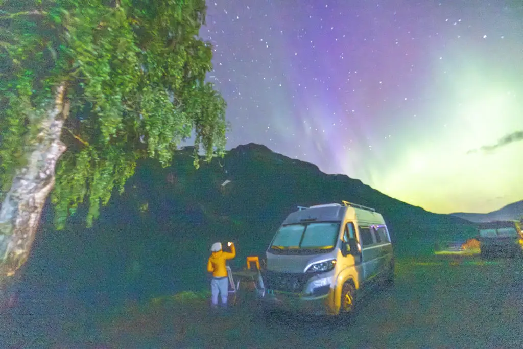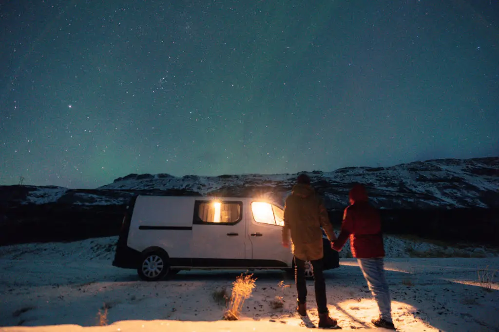 Guided tours are ideal for newcomers who prefer local knowledge and safer travel at night. Guides monitor forecasts, know local pullouts, and avoid risky roads. Tours also provide transport, which removes stress about driving on icy roads. On the other hand, self-driving gives flexibility: you can chase clear skies and stay later if conditions improve. If you self-drive, rent a vehicle suited for winter with GPS and studded tires during season. Cost is another factor—tours add price but reduce uncertainty and liability. Consider a hybrid approach: try one guided night to learn local behavior and follow up with a self-drive night using what you learned. Whichever option you choose, plan for contingencies and always tell someone where you are going. (Image alt text: Small group on a guided northern lights minibus tour.)