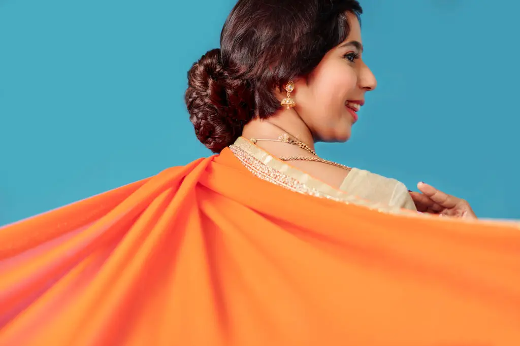 A high bun can feel dramatic and keeps hair off your neck, which helps when venues get warm. The trick in humidity is to make the bun secure and compact so sweat doesn’t loosen it. Start with textured hair—add a small volumizing powder or dry shampoo at the roots for grip. Use a bun donut or padding to form a tidy base and wrap hair tightly around it, tucking ends underneath and pinning with strong U-pins. Netting around the bun adds another level of hold and will hide pinwork. Keep products light; a heavy gel may weigh hair down and attract humidity. Place accessories like pins or jewels close to the scalp so they don’t pull on the structure. This style suits sangeet nights and reception dances because it keeps hair controlled during movement. If you plan vigorous dancing, anchor the bun with an extra invisible elastic and a few strategically placed pins to make sure it stays in place all evening. Carry a small bottle of anti-frizz spray for quick misting if humidity spikes.
