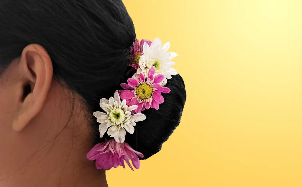 The low chignon is a timeless choice and becomes especially durable in humidity when kept compact and paired with a gajra designed for long wear. Prep by smoothing hair with a cream serum and working any loose ends into the coil neatly. Coil hair into a low chignon and secure with pins; wrap a thin elastic if you want added reinforcement. If you're using a fresh gajra, anchor it to the buns with a few pins tucked beneath the chignon so the flowers don’t droop or shift with heat. For humid climates, favor smaller, tightly coiled gajras or artificial floral pieces that won’t wilt. Seal the look with a flexible anti-frizz spray that lets the chignon remain soft while resisting humidity. This style is well-suited for more traditional ceremonies and looks especially good with sarees and heavier jewelry because the low placement keeps the profile balanced and comfortable throughout the day.