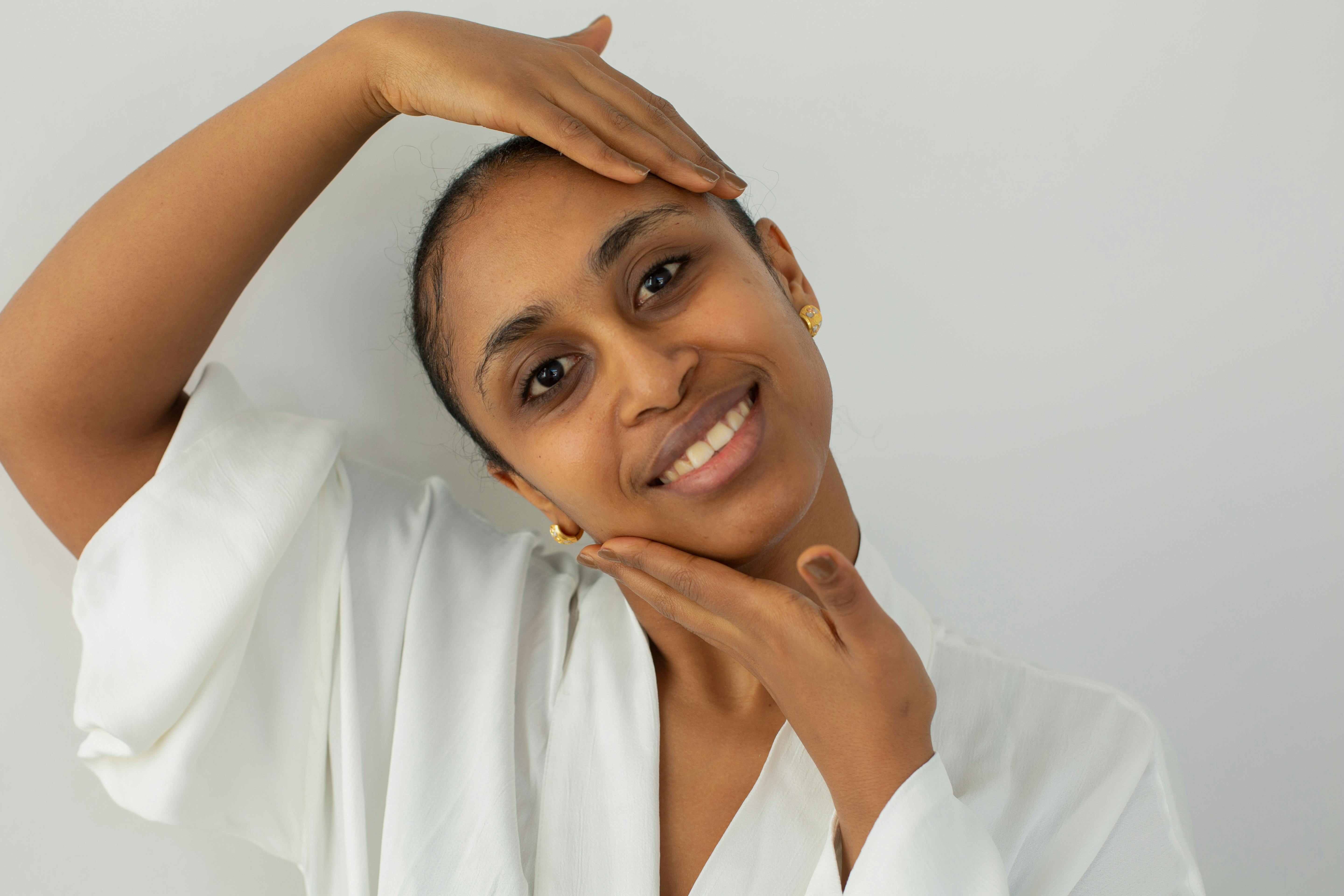 A cheerful woman in a white robe smiles and poses with hands framing her face. Photo Credit: Pexels @Monstera Production