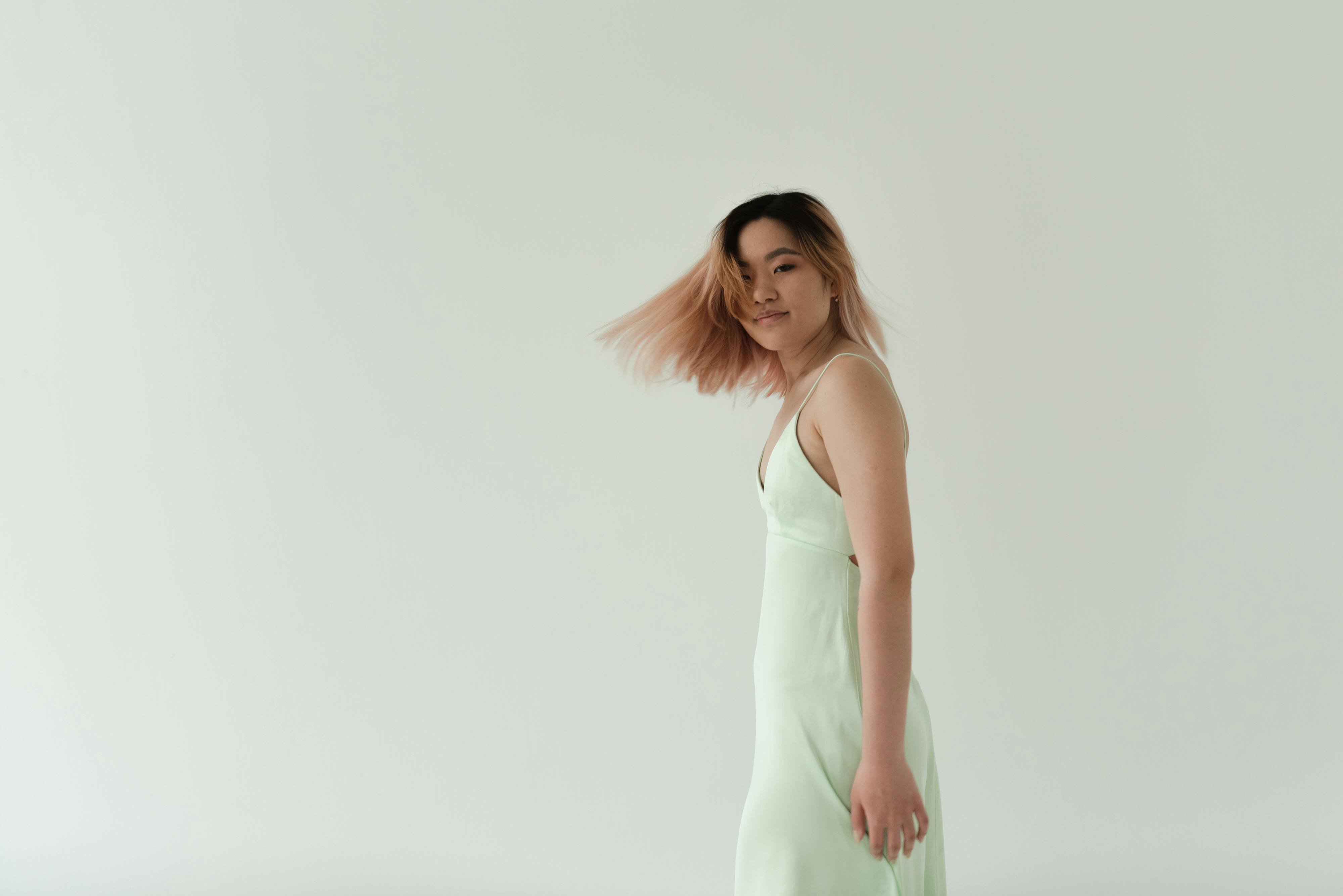 Stylish woman flipping hair in elegant dress against neutral studio backdrop. Photo Credit: Pexels @Arina Krasnikova