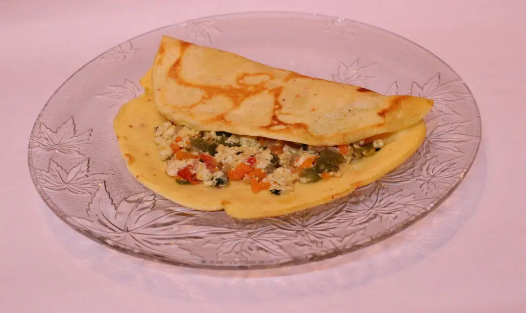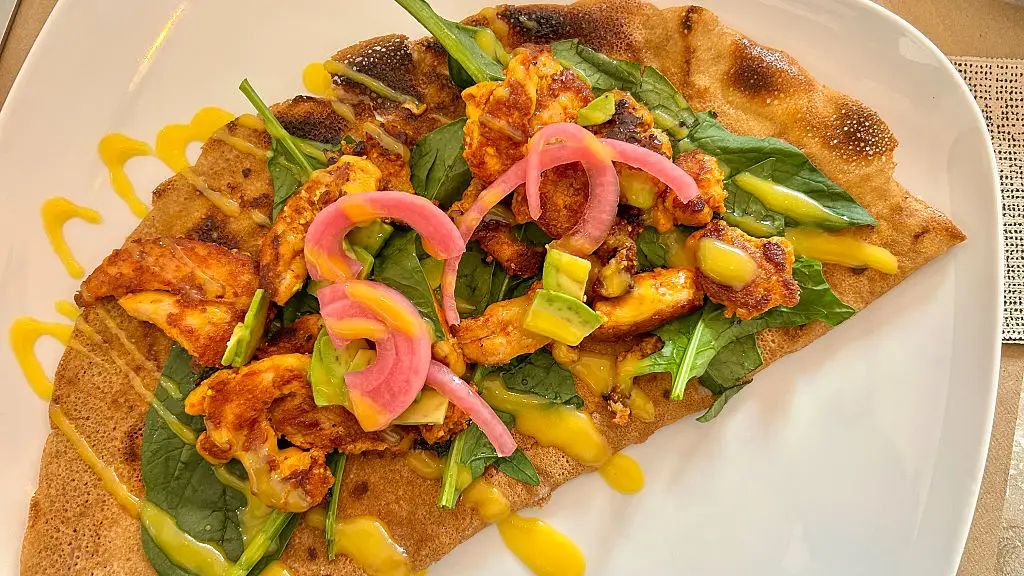 Make a dosa that acts like a delicate crepe and stuff it with Mediterranean flavors for a cross-cultural bite. Cook thin, crisp dosa from fermented rice-lentil batter or use thin buckwheat crepes as a shortcut. Spread whipped hummus, add roasted peppers and zucchini, sprinkle pomegranate arils for freshness, and finish with a drizzle of lemony yogurt or tahini. This filling highlights the dosa’s crisp texture while keeping flavors bright and approachable for guests who may be new to South Indian cuisine. For a vegan version, skip the yogurt and use a lemon-tahini drizzle instead. Dosas are naturally gluten-free when made traditionally, making them great for mixed-diet crowds. Assemble the filling just before service to keep the crepes crisp; if you need a party-friendly format, roll them into pinwheels and secure with skewers for an elegant platter. This dish nods to regional Indian technique while welcoming Mediterranean ingredients, and it photographs beautifully when sliced on the bias.