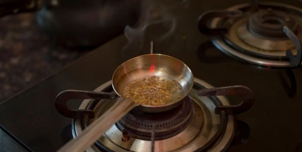 Tempering is the flavor crown for Ven Pongal and should be hot when added. Heat 2 tablespoons of ghee (30 ml) in a small pan over medium heat. Add 1 teaspoon whole cumin seeds and a teaspoon of whole black peppercorns; let them sizzle and pop for a few seconds to release oils. Add grated ginger—a teaspoon or so—and a handful of fresh curry leaves; they crisp up quickly and perfume the ghee. Toss in broken cashews (about 1/4 cup) and fry until they turn light golden. If you prefer vegan cooking, use neutral oil or vegan butter and skip the ghee. Be careful not to burn the spices or cashews; remove the pan from the heat just before the cashews reach a deep brown. The sizzling hot tadka poured over the pongal produces the signature fragrance and mouthfeel—peppery heat, cumin warmth, and rich ghee notes that combine into the classic Ven Pongal profile.