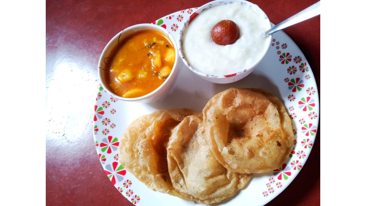 This dish will remind you of The pooris and aloo curry served in almost all railway stations..here we have also added a payasam (kheer)topped with gulab jamun. Photo Credit: Wikimedia Commons @Soumyasmita Mallick