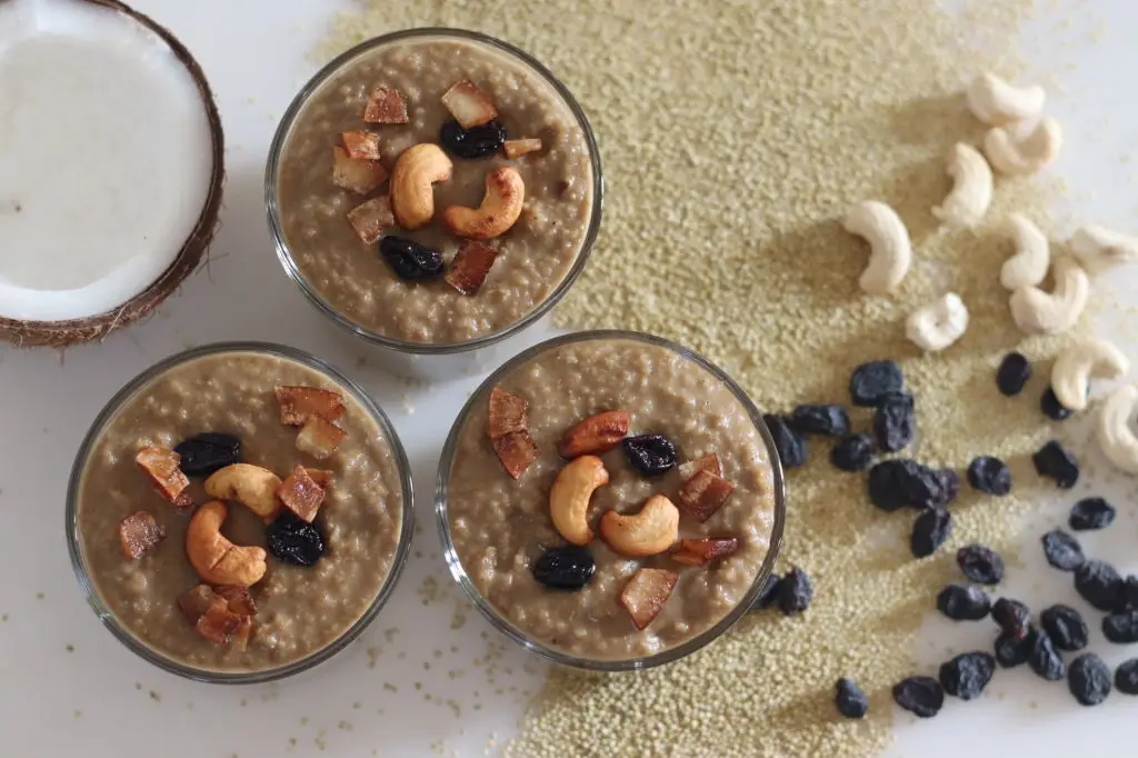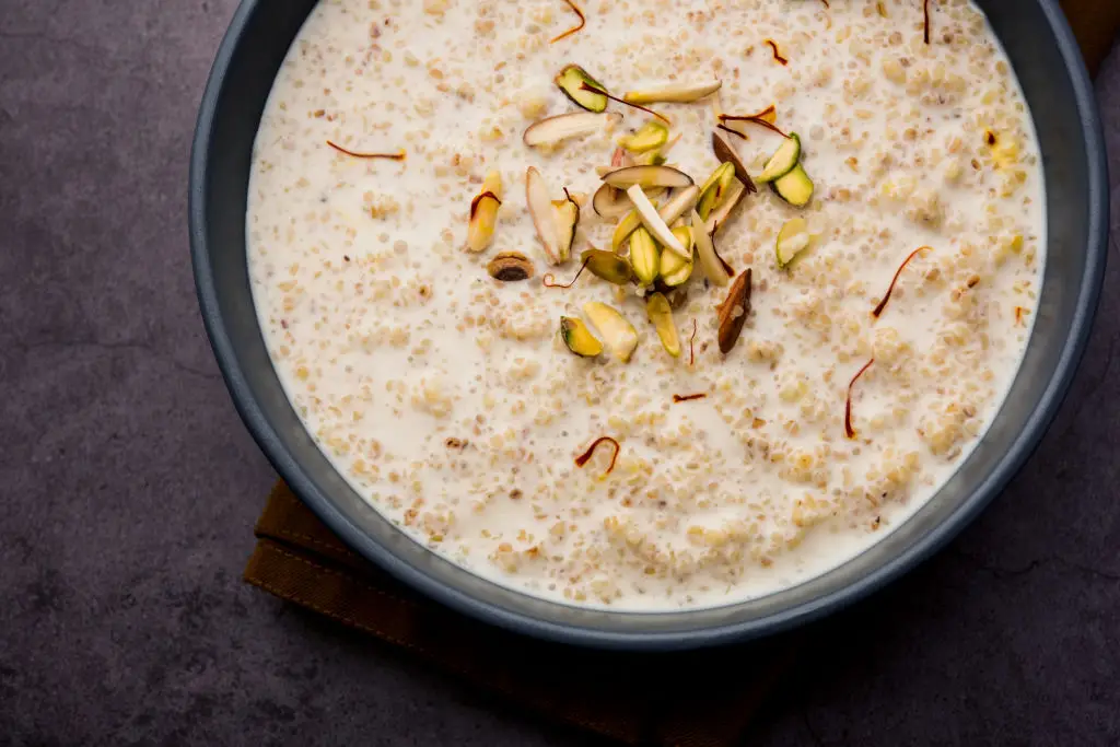 Kheer—rice cooked in milk with cardamom and nuts—has a place on many festival tables. Swap white rice for barnyard millet, foxtail millet, or ragi for a higher-fiber pudding with a pleasant chew. Cook the millet gently in milk or a plant-based milk for a lighter finish; simmer until grains are soft and the milk thickens slightly. Sweeten with jaggery or a modest amount of honey, warmed until dissolved, then add green cardamom and chopped nuts for texture. If you want protein, stir in a spoonful of ground roasted almonds or a small dollop of Greek yogurt once the kheer has cooled slightly—this adds body without curdling. Serve warm or chilled; the millet’s nutty flavor pairs well with saffron threads and toasted pistachios. Using millets raises fiber content and gives kheer a rustic, comforting character similar to the rice original but with a modern, health-forward twist.