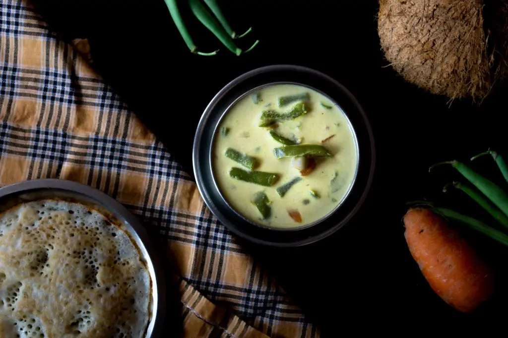 Ingredients (counted): mixed vegetables (carrot, potato, beans), coconut milk, mustard seeds, turmeric, curry leaves (fresh or dried). Temper mustard seeds in hot oil until they pop, then toss in curry leaves for an immediate aroma—this simple step delivers the layered fragrance you expect from a restaurant. Add vegetables and turmeric, then pour in coconut milk and simmer until vegetables are tender and the sauce is slightly reduced. Cook time is about 20 minutes. If you want a more restaurant-style finish, mash a few cooked vegetable pieces against the pan to thicken the sauce naturally. Serve with steaming rice and a wedge of lemon to brighten flavors; the tempering on top gives the dish visual contrast like a pro chef’s plate.