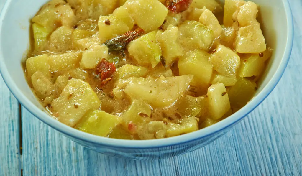Olan brings a gentle, coconut-forward note to the sadya. The dish typically combines ash gourd (called chena or winter melon) with black-eyed peas in a thin coconut milk spiced lightly with green chilies and curry leaves. Olan is deliberately mild; its role is to soothe the palate amidst bolder flavors. In North America, winter melon can be harder to find but winter melon or winter squash varieties can be used, and canned or cooked black-eyed peas are fine substitutes for dried ones. Use fresh coconut milk if you can for sweetness and texture; canned coconut milk is an excellent shortcut when fresh isn't available. Difficulty: Easy. Time: 30–35 minutes. Serving tip: Serve slightly warm; Olan's mildness makes it a good match for spicy sambar or pachadi.