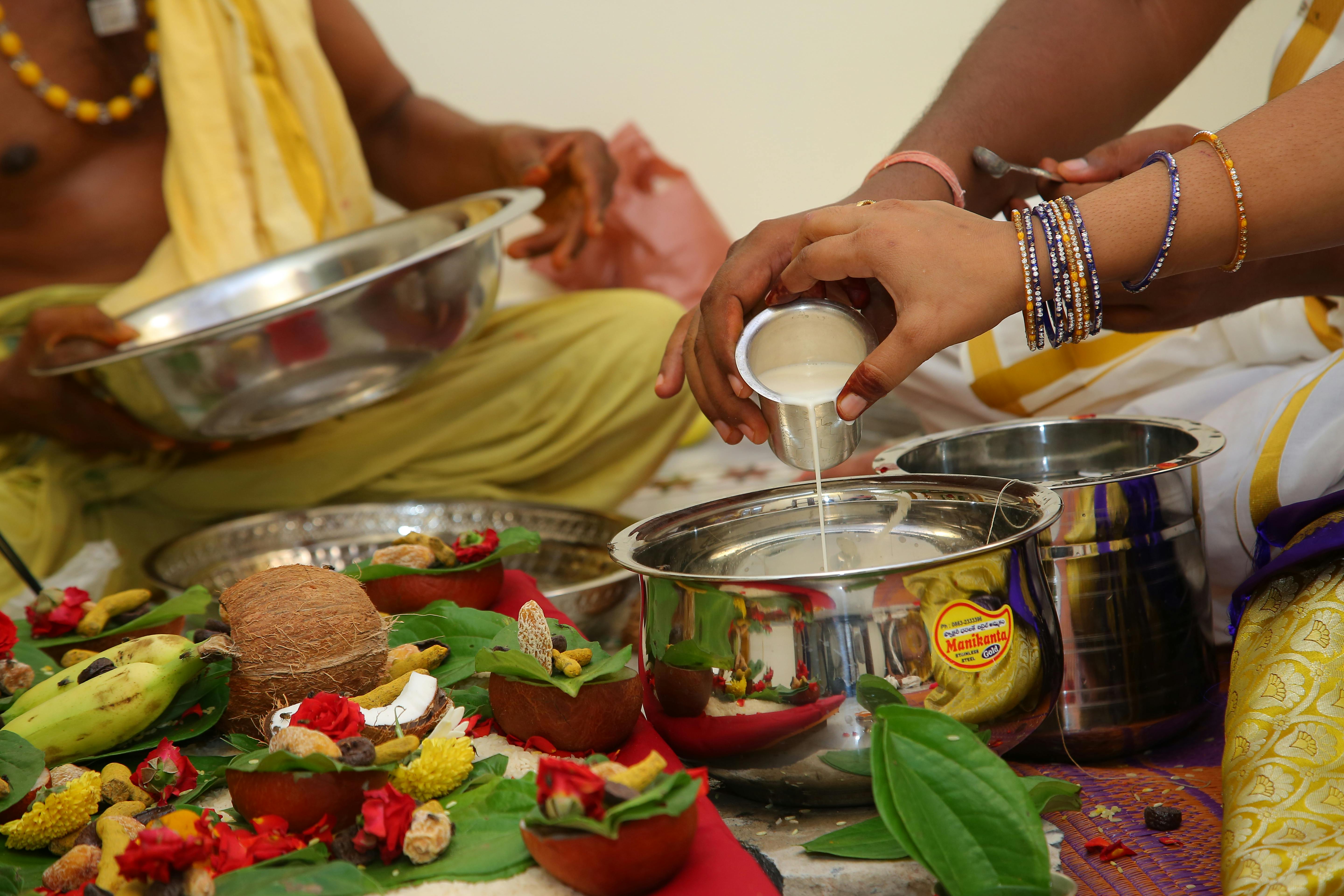 Close-up of a traditional Indian ritual with hands preparing offerings, emphasizing cultural richness. Photo Credit: Pexels @Guntaka Subbareddy
