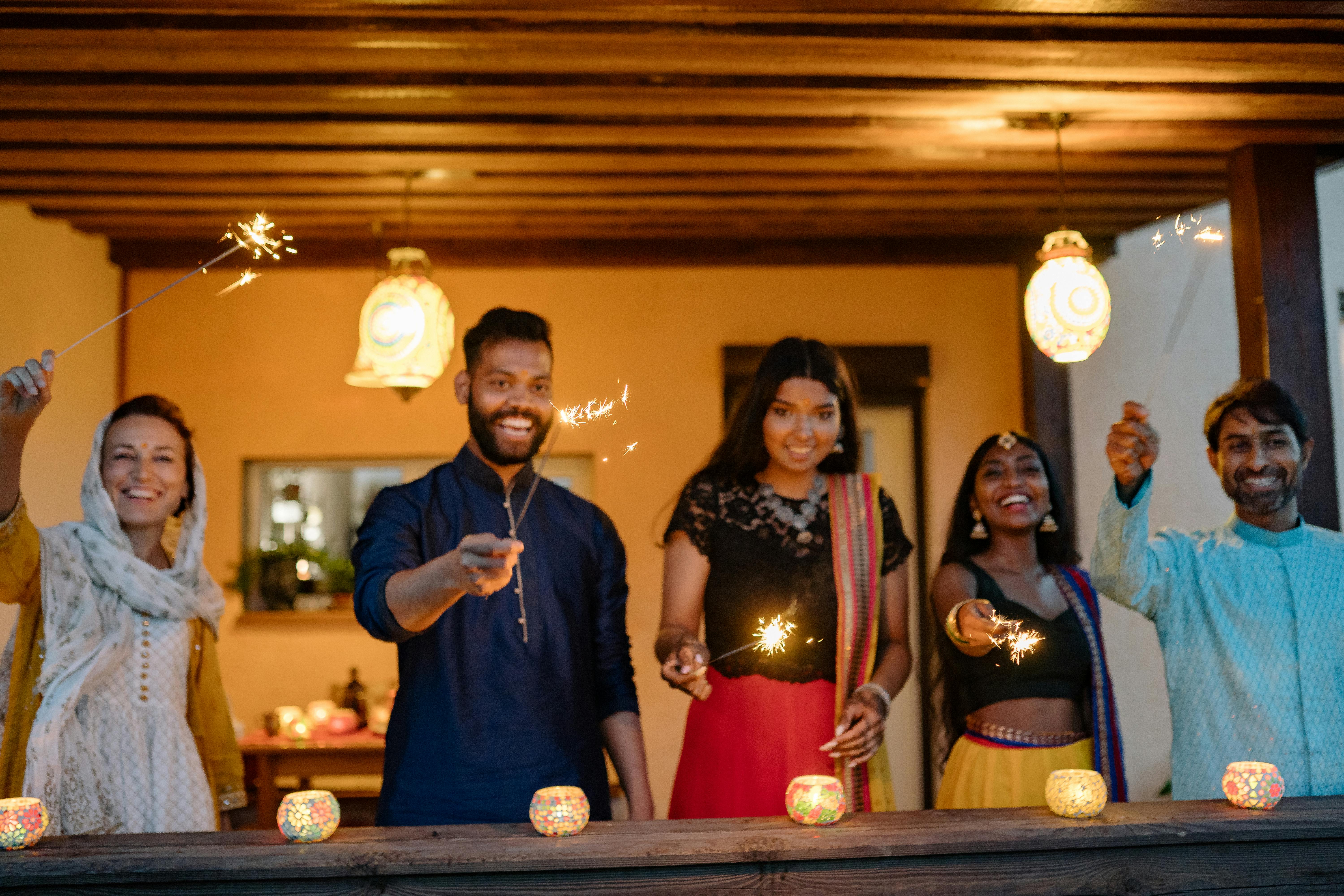 Group of people joyfully celebrating Diwali with sparklers and traditional attire. Photo Credit: Pexels @Yan Krukau