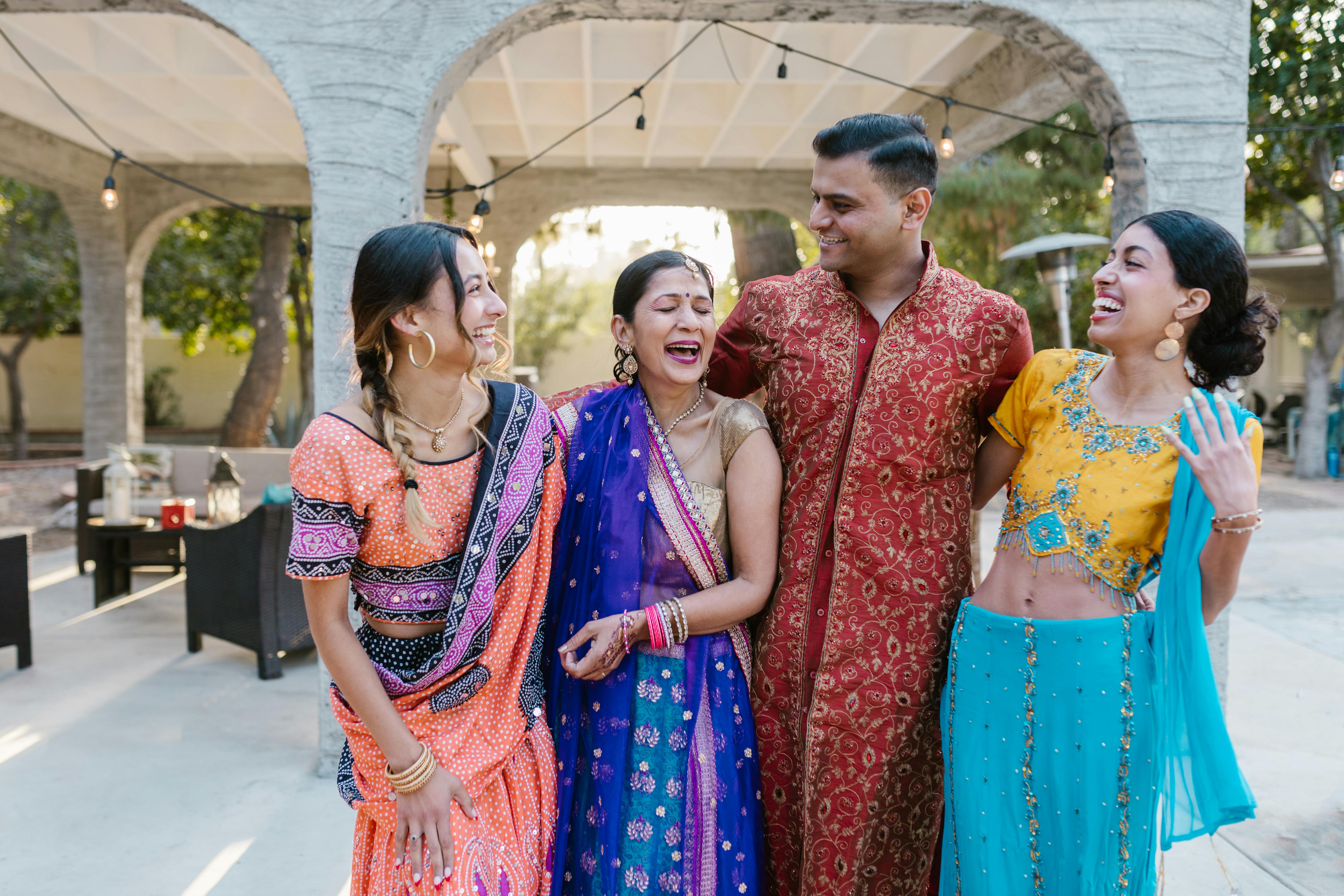 Four people in traditional clothing share a joyous moment outdoors. Photo Credit: Pexels @RDNE Stock project
