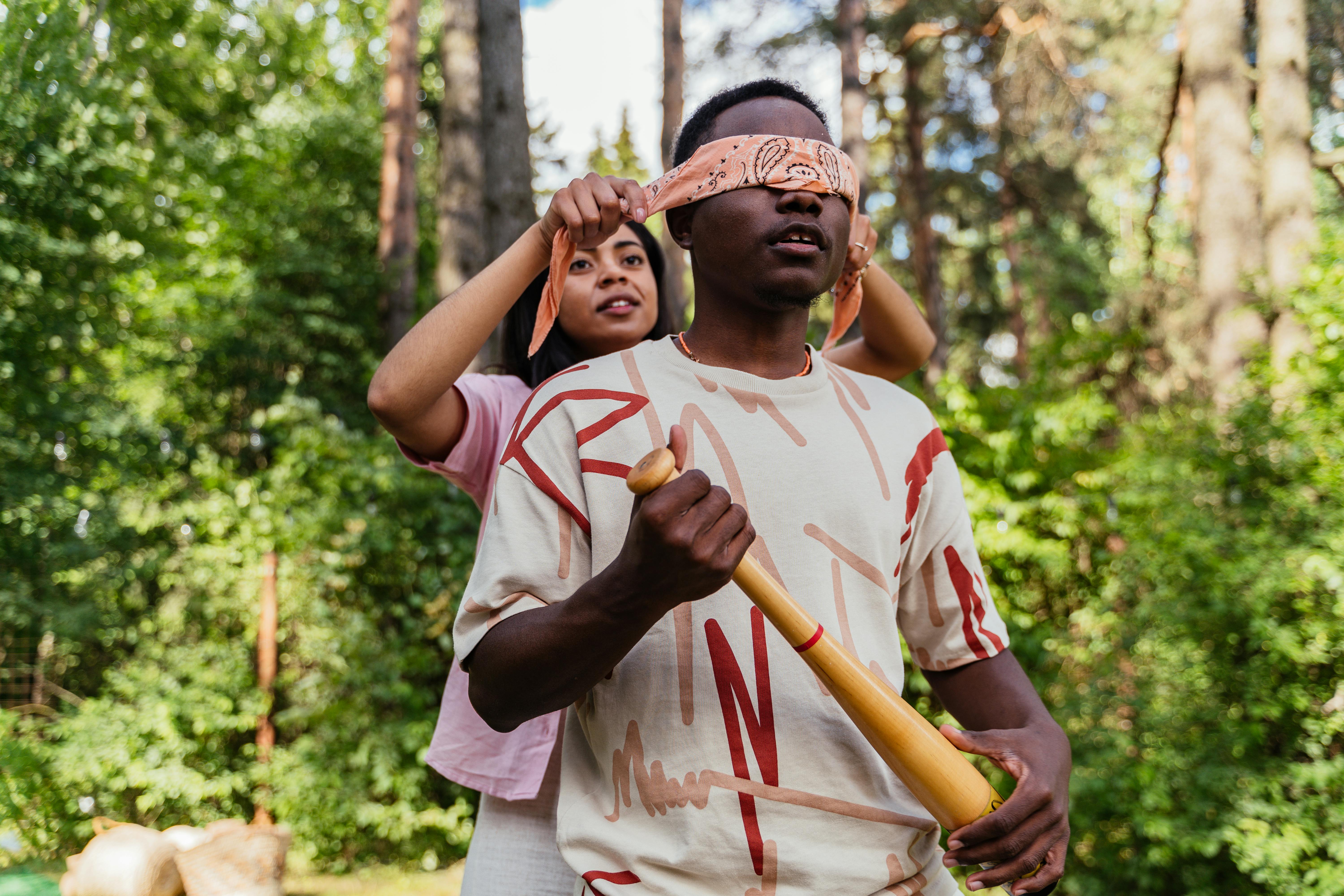 Close-up of two friends enjoying a blindfold game in a lush green forest. Photo Credit: Pexels @ANTONI SHKRABA production