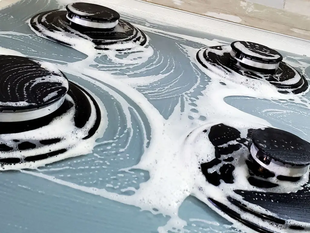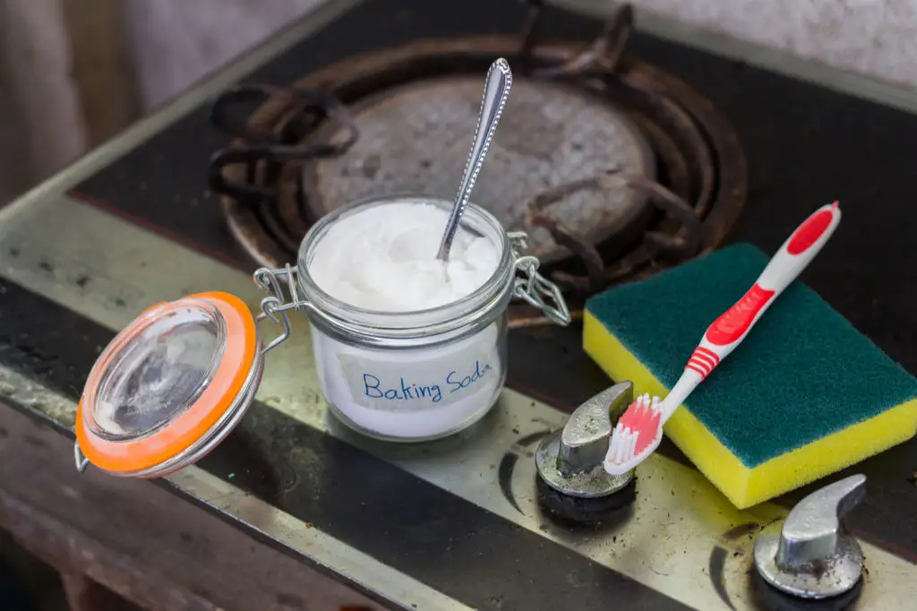 Materials needed: baking soda, warm water, soft sponge, spray bottle with dish soap solution. Make a paste of baking soda and warm water and apply to greasy stove areas, focusing on burners and splatter zones. Let the paste sit for 10–15 minutes so it loosens baked-on grease. Wipe with a damp soft sponge and spray with mild soap solution for stubborn spots. Time estimate: 15–20 minutes for a standard four-burner stove. Pro tip: remove burner grates and soak them in a vinegar-water solution to lift grime while you scrub the hob surface. Natural pastes reduce strong chemical fumes and leave the kitchen smelling cleaner quickly (India Today and Times of India recommend gentle, ingredient-based degreasing for household stoves).